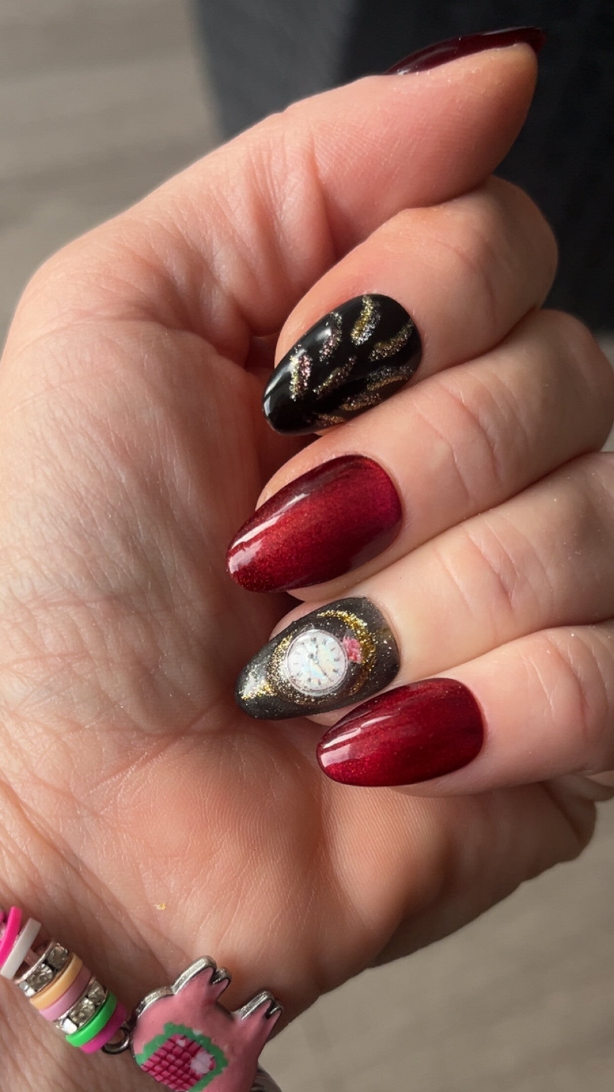 ⏰ Sur l’autre main, la boule de Noël avec l’horloge représente le temps qui s’écoule,